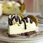 Crush half the cookies (about 20) to make crumbs. Combine crumbs with melted margarine and press into the bottom of a 9-inch springform pan or pie plate. Stand remaining cookies around edge of pan. Spread 3/4 cup fudge topping over crust. Freeze 15 minutes.