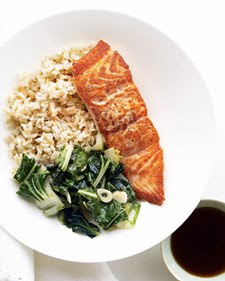 Nutritious salmon, whole grains, and a side of greens will fill you up with the good stuff.