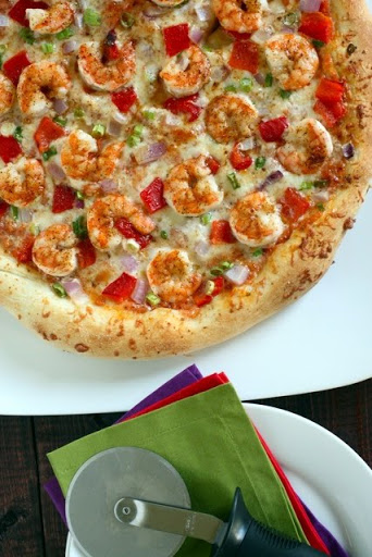 Meanwhile, sprinkle the Romano and mozzarella cheeses evenly over the pizza dough. Top with roasted red pepper, red onion, and green onions. Evenly distribute the cooked shrimp over the pizza. Sprinkle the pizza with additional Cajun seasoning, if desired.
