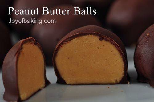 Note: If you want to make Buckeyes: place a toothpick into each peanut butter ball and dip, one ball at a time, into the melted chocolate, leaving the top quarter of each ball undipped.