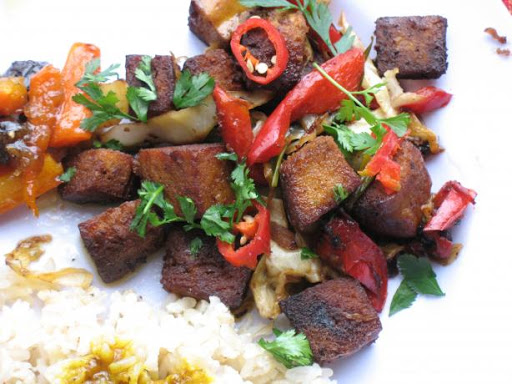 Bake until liquid evaporates completely and tofu is deep brown, about 45 minutes. (The pan will look a bit burned around the edges.) Let cool at least 15 minutes before eating.