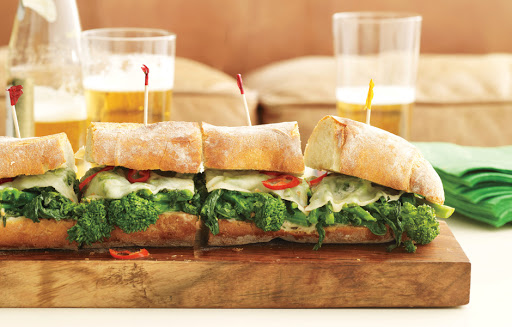 Arrange racks in top and bottom thirds of oven; preheat to 400°. Open rolls and arrange on 2 rimmed baking sheets. Drizzle generously with oil. Spread bean purée on one side of each roll; add broccoli rabe. Top with cheese, then chile. Toast, rotating pans after 5 minutes, until cheese is melted, 7–10 minutes. Top, slice, and serve.