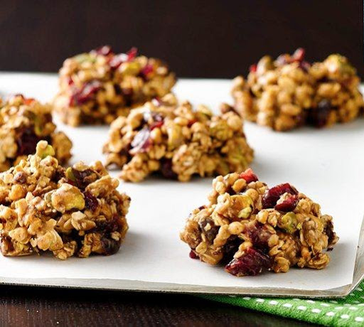 1 Line cookie sheet with waxed paper. In large bowl, mix granola, cranberries and pistachio nuts.