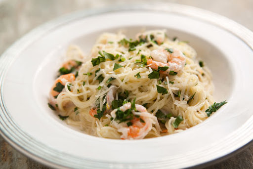 *When* the pasta is done, drain, reserving some of the water. *Pour* the shrimp and lemon sauce into the pasta and mix well, adding pasta water as necessary.