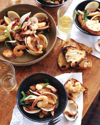 Add the clams and wine and cook uncovered, stirring, until half of the clams are opened, about 4 minutes. Add the shrimp and cook, stirring, until all of the clams are open and the shrimp are pink and cooked through, about 4 minutes longer. Serve in deep bowls with crusty bread to sop up the sauce.