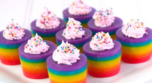 To serve, loosen around the edges of each muffin cavity and pop out the jelly shots. Immediately before serving, garnish with a small dollop of frosting and sprinkles.