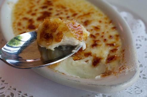 Sprinkle a layer of brown sugar on top the creme brulee and broil until melted and caramelized.