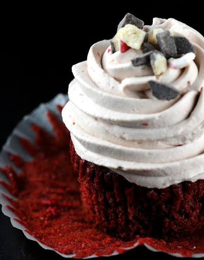 Peppermint Bark Red Velvet Cupcake with Hot Chocolate Whipped Cream Frosting