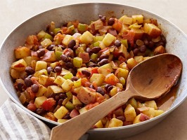 Transfer the hash onto serving plates. With the heat off, wipe out the pan again. Spray it with cooking spray, turn heat on to medium-low and cook the eggs, sunny-side up, or over-easy. Put an egg on top of each mound of hash. Serve with hot sauce.