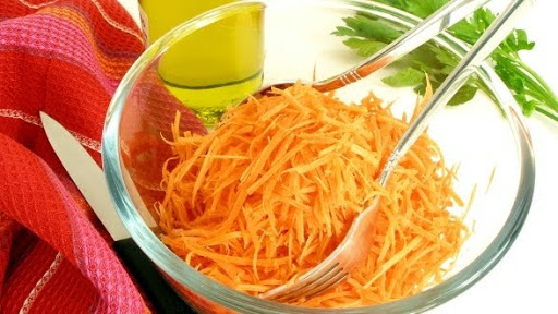 Today, we’re featuring a classic everyday type French dish — carottes râpées (grated carrots salad). A low calorie dish, carottes râpées are a great way to help your family eat their veggies (and get all the benefits of carrots) while enjoying a delicious dish — they may be asking for more! In France, it is typically served before a main course (which has the advantage of making you less hungry for the rest of the meal).