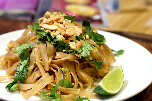 Serve noodles with lime wedges, topped with cilantro and peanuts.