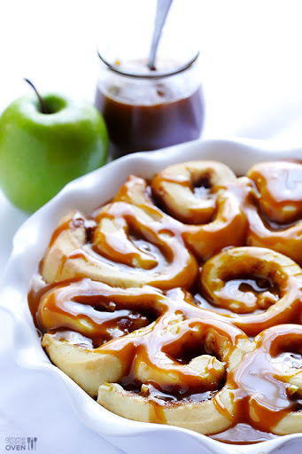 When the dough is ready, turn it out onto a floured work surface. Then use a floured rolling pin to roll the dough out into a large rectangle, about 14 x 9 inches in size. (If you want all edges to be even, you can use a pizza slicer to cut the dough into a perfect rectangle. Don't worry about cutting away extra dough -- this recipe makes plenty.) Use a knife or pastry spatula to spread the softened butter out evenly over the entire surface of the dough. Then sprinkle evenly with the cinnamon and sugar mixture. Then sprinkle on the finely chopped apples, and drizzle with 1/2 cup caramel sauce.