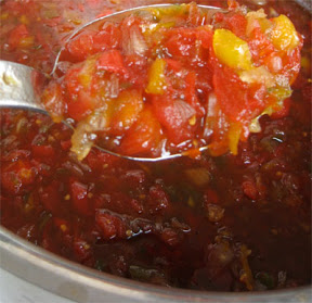 4. Pour relish into hot sterilized half pint jars, leaving about 1/2 inch head room.