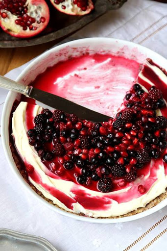 In a food processor, pulse almond flour, walnut pieces, cardamom and salt together. Add the dates one at a time. The crust will be crumbly but will stick together when pressed into your pie dish. Whip cheese and honey together with fork until well combined. Pour cheese mixture onto crust and chill to set, about an hour. Mix frozen berries with maple syrup in a pot until warm. Top the cheesecake with the berries and pomegranate. Serve.