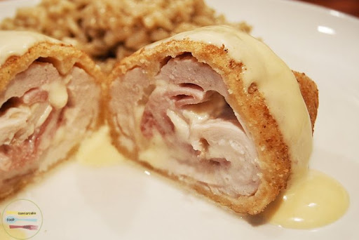 Top each cutlet with a slice of ham and cheese - then roll up tightly, tuck in the ends and secure with toothpicks.
