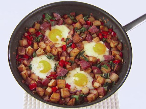 Make 4 indentations in the hash and break an egg into each. Cook until the eggs are cooked through, 5 to 6 minutes.
