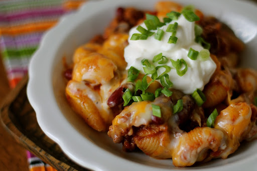 Pour the chili pasta mixture into a 9×13 pan. Flatten out with a spatula and sprinkle with cheese. Place in the oven for 30 minutes or until the edges are bubbling and the cheese has fully melted.