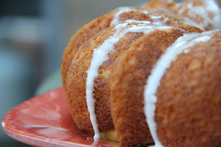 To make the glaze, combine powdered sugar with milk and extract and mix together with a spoon. (Add more powdered sugar if your glaze is too runny or more milk if it's too thick.) Spoon over cooled cake.