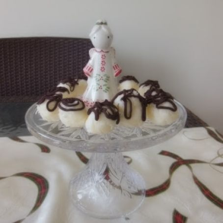 place chocolate chips in a small heavy duty, zip-lock plastic bag and seal. Submerge in hot water until chocolate melts. Snip tiny hole in one corner of bag and drizzle chocolate over coconut balls. let candles stand until firm. store in refrigerator.