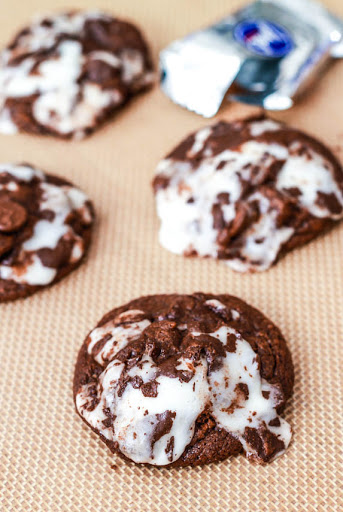 Preheat oven to 350F degrees. Scoop about 2 Tablespoons of dough and roll into a ball. Press a few pieces of peppermint patties on the tops of each cookie ball. Bake for about 10 minutes, or until the cookies have just begun to set with the centers still appearing very soft. They will firm up as they cool.