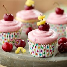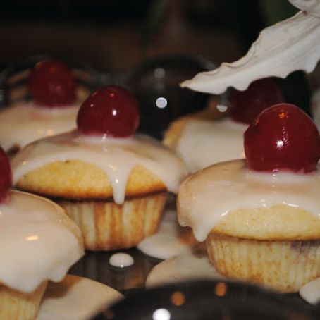 pat maraschino cherries dry with a paper towel. frost each cupcake with about 1/2 teaspoon icing. dip half of each cherry into remaining icing; place on top of baby cakes