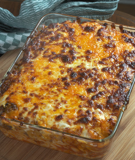 Bake it in a 400 degree oven till it’s piping hot (about 45 minutes if it’s cold to room temperature). Just before you’re ready to eat, remove the foil, cover macaroni with the cheese and broil.