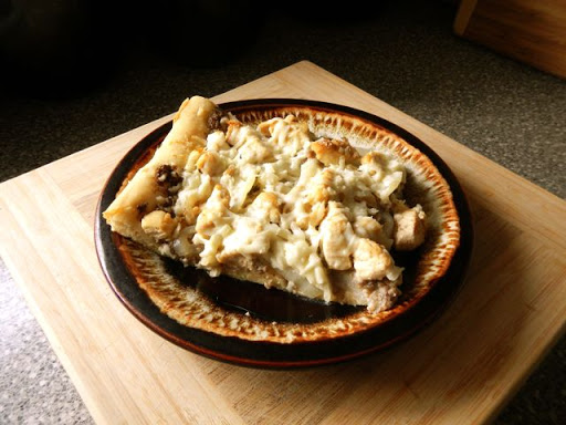 Roll out pizza dough. Drizzle with truffle oil. Spread mushroom paste over dough. Sprinkle generously with romano or parmesan cheese. Layer on onions. Layer on chicken. Cover with asiago cheese. Bake until crust is golden brown.