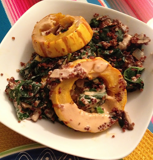 In a large skillet over medium heat, add a little water, then add onions and sauté for about 5-7 minutes, until onions are softened. Add mushrooms and garlic and cook for about 8 minutes more, stirring frequently. Add kale and cook until it is bright green and slightly wilted, about 3 minutes. Add cooked quinoa and delicata squash and stir well to combine. Removed from heat and drizzle with tahini sauce. Serve at once. Refrigerate leftovers and serve chilled, reheated, or at room temperature.