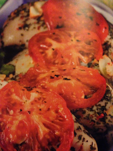 Sprinkle 1 teaspoon parsley and 1 teaspoon basil evenly over the bottom of the baking dish. Arrange chicken breast halves in the dish, and sprinkle evenly with garlic slices. In a small bowl, mix the remaining 2 teaspoons parsley, remaining 2 teaspoons basil, salt and red pepper; sprinkle over the chicken. Top with tomato slices.