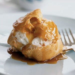 Scoop the dough by 1/4 cupfuls into 8 mounds 2 inches apart onto prepared pan. Bake at 425° for 20 minutes. Reduce oven temperature to 350° (do not remove pan from oven); bake an additional 30 minutes. Turn oven off. Pierce top of each cream puff with a knife; return pan to oven. Cool cream puffs in closed oven for 20 minutes. Remove from oven; cool completely on a wire rack.
