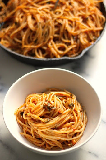 Once pasta is cooked and drained, add it to the sauce and and stir to coat the noodles. Reduce heat to low, cover pan, and let pasta cook in the sauce for 2-3 minutes.