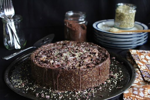 To make the crust: pulse the hemp and flax seeds and cacao in your food processor until they become a rough flour, then add the dates and process until it all gets sticky. Press into the bottom and up the sides of a spring form pan. Put in the fridge.