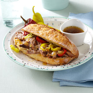 Cover and cook on low for 8-10 hours or until tender. Remove meat; cool slightly. Skim fat from cooking juices. Shred beef with two forks and return to slow cooker; heat through. Place 1/2 cup on each roll, using a slotted spoon. Serve with pepperoncini and pepper rings if desired.