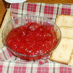 After the rhubarb mixture has boiled for 10 minutes, remove from heat, and stir in strawberry flavored gelatin powder. Transfer to sterile jars, seal with lids, and process for 15 minutes in a boiling water bath. Allow jars to cool in a draft-free area. Refrigerate jars after seal has been broken.