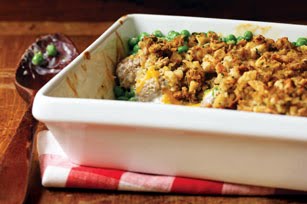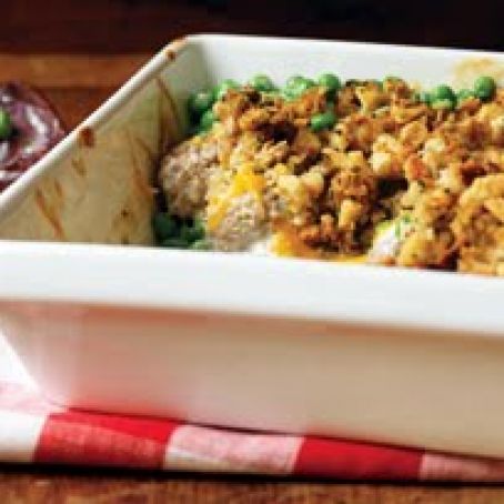 MIX soup and milk in 13x9-inch baking dish. Stir in meatballs and peas; top with cheese and stuffing.