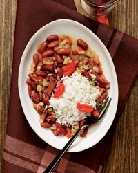 Ladle the beans into bowls and top with a mound of rice. Garnish with more Peppadews and serve right away.
