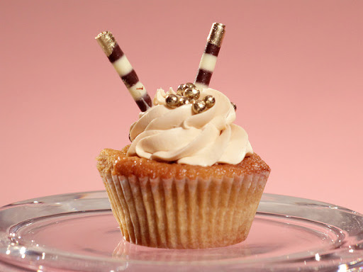 To assemble: Place a round tip # 809 into a large piping bag. Fill the piping bag with Irish Buttercream. Generously pipe about 1 ounce buttercream onto each cupcake. Garnish each cupcake with 4 or 5 small chocolate pearls and a chocolate cigarette. Mix equal parts gold dust with vodka to make an edible gold paint. Using a small round brush, paint the ends of the chocolate cigarettes. The edible paint will dry leaving behind the gold dust.