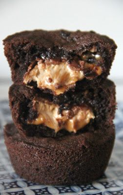 4. Fill each muffin tin about 1/4-1/2 full with batter. Press in a piece of the Snickers bar and cover with more brownie batter. The tin should be about 3/4 full.