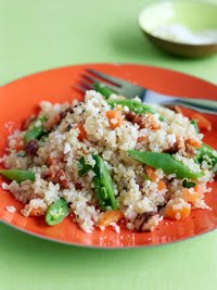 3.Stir in quinoa and stock. Cover and cook 10 minutes. Stir in 1/2 cup water, cover again, and cook 5 minutes. Stir in carrots and the final 1/2 cup of water if needed to keep quinoa very moist. Cover and cook until carrots are tender, 10 to 15 minutes longer. Add sugar snap peas for last 5 minutes of cooking. Season with salt and black pepper to taste. Serve topped with cheese and walnuts.