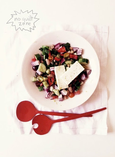 • cut the feta into a few large bricks and lay on top of the salad. it looks pretty, people will be impressed and you can easily break the cheese up with your salad servers as you individually plate the salad. plus people who hate feta, will be very grateful, since this will be much easier for them to pick out of the mix.