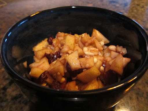 Chop apples into very small pieces and mix with nuts. Add cinnamon and wine and mix together. Put into a sealed carton and let sit overnight for best flavor.