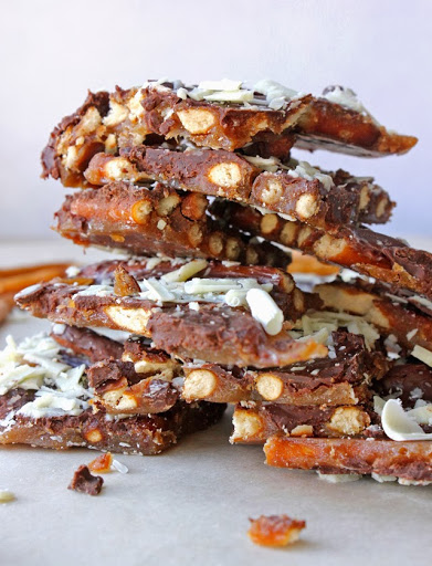 Bake 10 minutes. (Mixture may look foamy.) Remove from oven; sprinkle evenly with chocolate chips. Return to oven 1 minute to soften chocolate chips. Remove from oven. Gently spread chocolate over pretzels; cool 30 minutes. Sprinkle with white chocolate curls; cool completely.