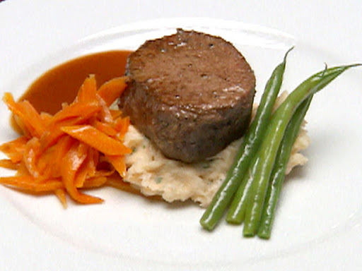 Plate a portion of mashed potatoes in the center of serving plate. Top with the filet mignon, spoon the Merlot sauce over and around and garnish with chopped chives.