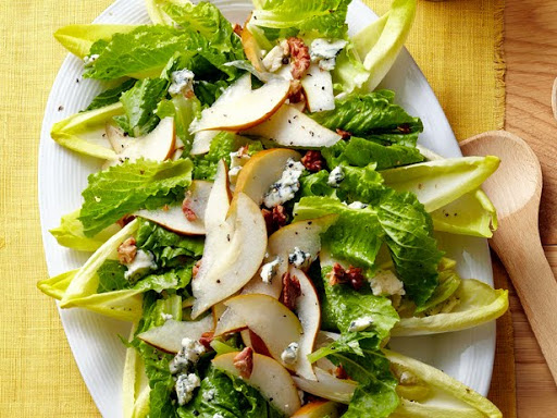 Clean the endive with a dry paper towel and slice off the bottom to separate the leaves. Arrange the leaves around the edge of a large platter. Fill the inside with torn romaine leaves. Cut the pear into thin slices and arrange throughout the platter. Sprinkle the gorgonzola and walnuts on top and season with pepper.