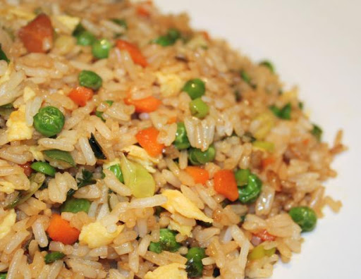 1 On low heat place 1 tablespoon of olive oil in large saucepan or wok. Cook beaten egg briefly, breaking into pieces. Remove and set aside. 2 Add 2 tablespoons olive to saucepan or wok. Add onions, carrot and peas. Stir-fry for 2 minutes. 3 Dissolve chicken bouillon cube in the 2 tablespoons water. Place in pan and add cold rice, garlic powder, soy sauce and sesame oil. Toss lightly to mix well and heat for 3 minutes. Add in egg pieces and mix. 4 Additional soy sauce may be added to taste. (One cup of finely chopped pork or chicken pieces may be added.) 5 Serve and enjoy!