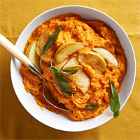 4. To serve, spoon potato mixture into a serving bowl. Top with apple mixture and fried sage leaves.