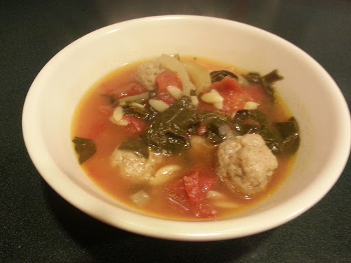 In a large pot, heat oil over medium. Cook onion, stirring occasionally, until softened, 3 to 4 minutes. Add broth and tomatoes (with juice); bring to a simmer. Add meatballs; cook, without stirring, until meatballs float to surface, about 5 minutes.