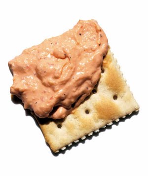 In a food processor, combine the Cheddar, mayonnaise, cream cheese, pimientos, and onion and puree until smooth. Season with ¼ teaspoon each salt and pepper. Serve with the saltines.