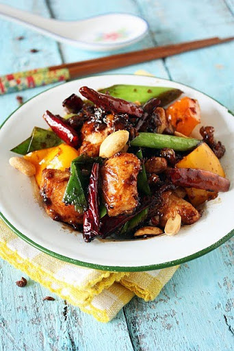 Add minced garlic and ginger, sichuan pepper to wok and stir a few seconds and fragrant. Pour the sauce mixture in , stirring all the time until the sauce gets dark thick and the sugar in it caramelizes. Add the chicken, leeks and stir quickly and lastly add peanuts.