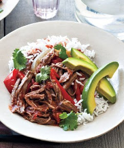 Using two forks, shred the beef and mix it into the cooking liquid. Serve with the rice and top with the avocado and cilantro.